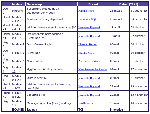 In 2026 starten er eind maart en eind september naast de opleiding OHV ook de module handzorg met de volgende lesdagen. Bij TCI leggen deelnemers een apart schriftelijk theorie examen af. Check de opleidingsgids voor meer informatie (vanaf pagina 14).